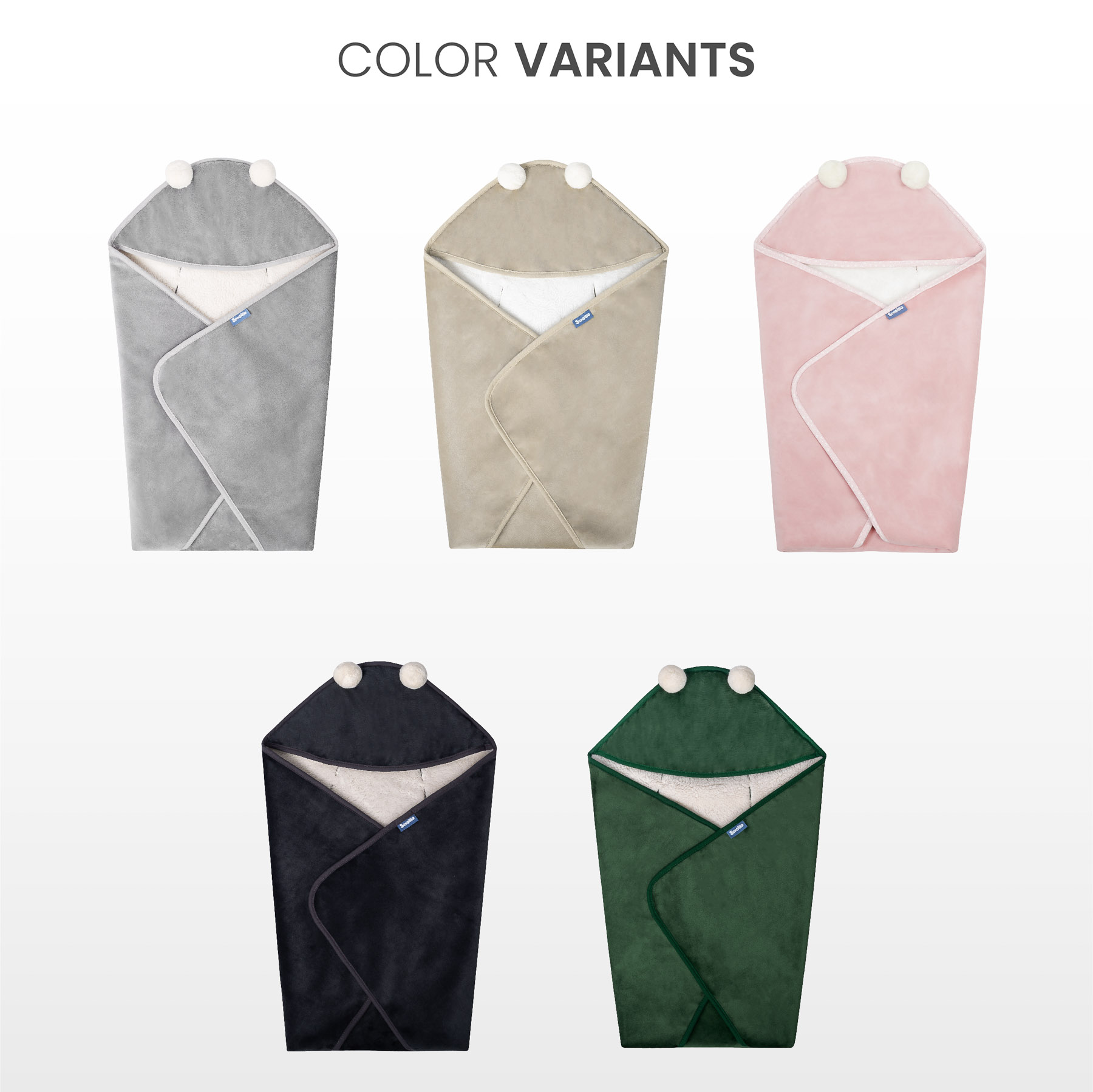 This carry cot was created with your baby’s comfort and safety while traveling in mind. Two beautifully combined layers provide warmth – a thick, soft plush exterior and an elegant, soft fabric interior. Special seatbelt cutouts allow for quick and safe harnessing without having to remove the wrap. A practical hood protects the head from the cold, and decorative pom-poms add a charming, child-like touch.