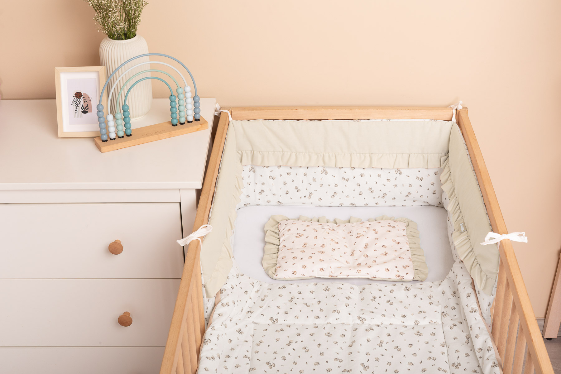 Komplet do łóżeczka – składający się z poduszki i kocyka – to wyjątkowy zestaw zaprojektowany z myślą o maksymalnym komforcie i spokojnym śnie Twojego dziecka. Dwustronny design sprawia, że zestaw jest zarówno praktyczny, jak i elegancki, a jego uniwersalność czyni go idealnym elementem wyprawki dla noworodka. Połączenie gładkiej bawełny z bawełną drukowaną ozdobioną delikatną falbanką nadaje całości wyjątkowego, stylowego charakteru.